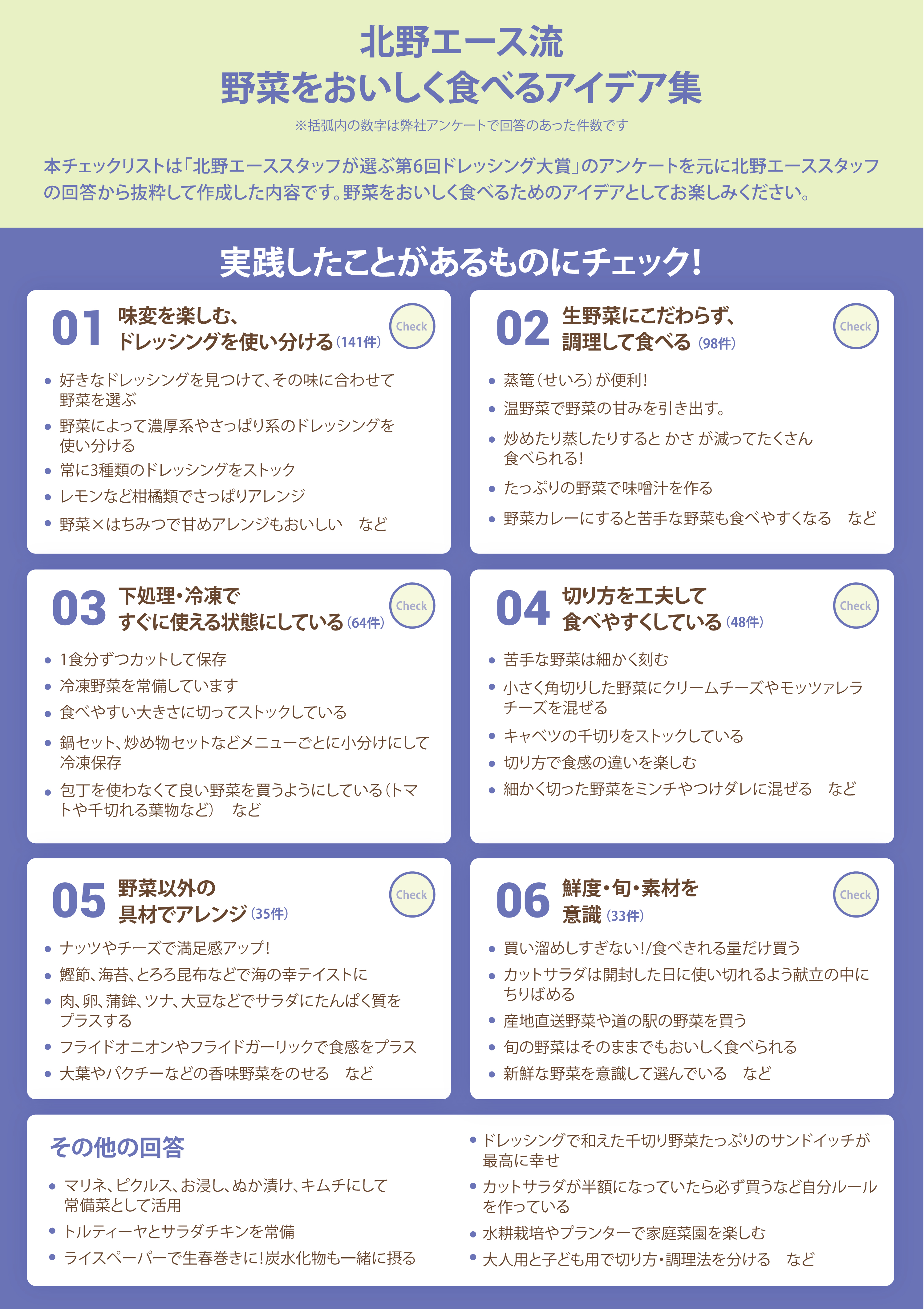 今回の「ドレッシング大賞」では、ドレッシング投票とあわせて全国のスタッフが実際に行っている「野菜をおいしく食べる習慣やコツ」についてもアンケート。総勢419名のスタッフから集まったリアルな意見を元に「北野エース流 野菜をおいしく食べるアイデア集」も公開いたします。ぜひ、チェックリストでお楽しみください!