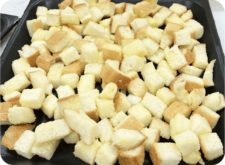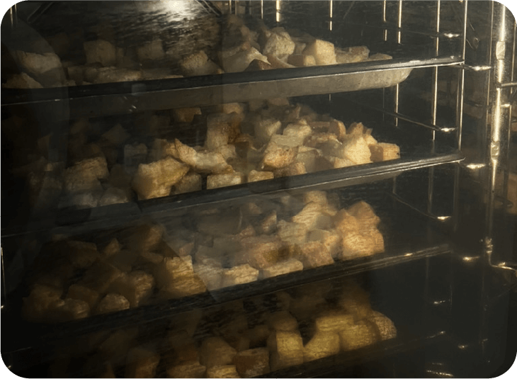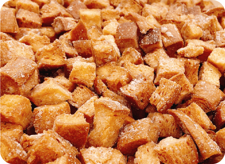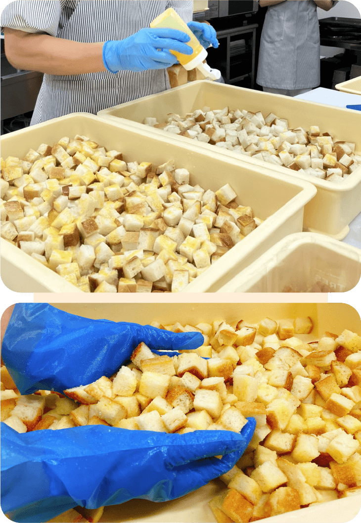 食パンを一口サイズに揃え、オーブンでじっくり焼き上げる事によってサクサクとした食感に仕上げるなどひとつひとつの作業行程を丁寧に行っています。ぜひ手作りの良さを味わって頂きたいと思います。